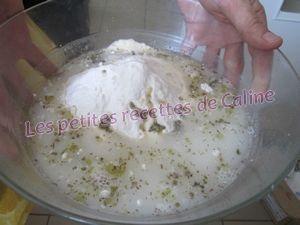 Dans le bol du robot, mélanger la farine, le sel, l’huile, la levure diluée, l’origan ainsi que 25 cl d’eau. Pétrir 15 min.