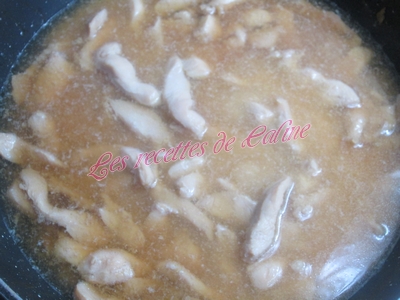 Faites chauffer votre wok et versez le poulet, bien faire revenir, verser du bouillon de façon a ce que votre viande soit recouverte..
