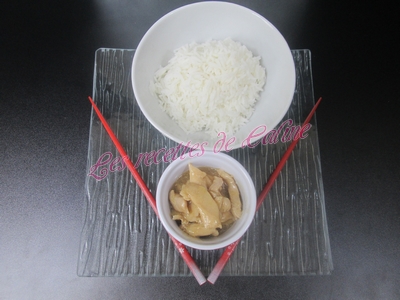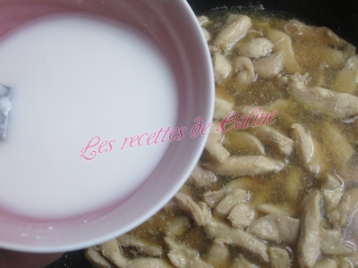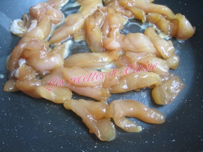 Faites chauffer votre wok et versez le poulet, bien faire revenir, verser du bouillon de façon a ce que votre viande soit recouverte..