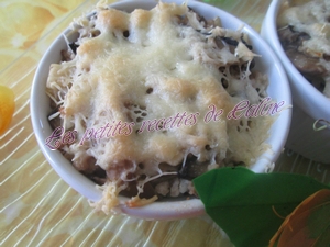 Mélanger aux crozets, répartir dans deux plats individuels, recouvrir de râpé et enfourner 15min à 180° (Th.6).