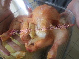 Epluchez et coupez un oignon en 4 et le mettre dans le poulet.