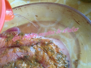Déposez la rouelle de porc dedans, puis la badigeonner de la marinade thym/citron, faire de même sur la seconde face.