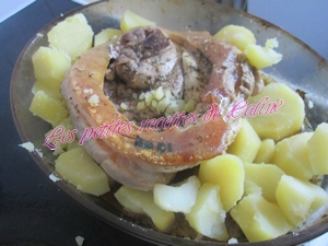 Au bout de ce temps de cuisson, déposer les pommes de terre autour de la rouelle, puis remettre un peu de marinade sur les pommes de terre. Continuer la cuisson pour 45 min supplémentaire, si besoin remettre un peu d’eau.