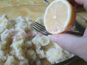 Ecrasez les pommes de terre à l’aide d’une fourchette ou d’un presse-purée dans un saladier ou directement dans la casserole. Incorporez la purée à la morue et mélangez. Ajoutez le filet d’huile d’olive, le jus de citron, puis l’ail. Pour lier le mélange, ajoutez le lait petit à petit en remuant.