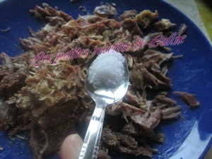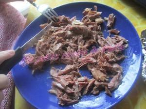 Enlevez la chair des cuisses en jetant la peau (réchauffer un peu s’il faut pour enlever la graisse) et coupez la en petits morceaux.