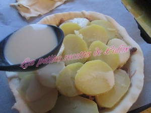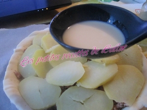 Dans un bol (ou saladier)mélangez les oeufs, le lait et la crème. Versez cette préparation sur les pommes de terre (je me sers d’une louche c’est beaucoup plus pratique).