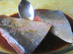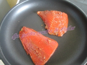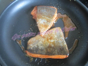 Dans une poêle anti-adhésive, mettre les pavés de saumon côté peau pendant 5 min (à adapter en fonction de l’épaisseur des pavés). Couvrir. Puis ajouter la marinade et arroser, retourner les saumons délicatement, laisser cuire 2 min.
