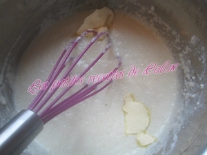 remuant laisser cuire 5 min. Hors du feu ajouter le beurre, laisser tiédir.