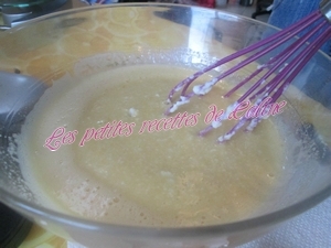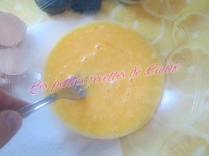 Dans un saladier, battre les oeufs avec le sucre jusqu’à blanchiment, ajouter la poudre d’amande puis la semoule tiède.