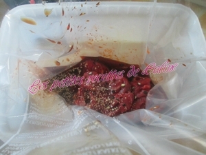 Dans un sac de congélation, mettre les lamelles de viande, la sauce soja, la sauce piment, l’ail semoule et les grains de poivre légèrement concassé, et laissez mariner 2 h minimum au frais.