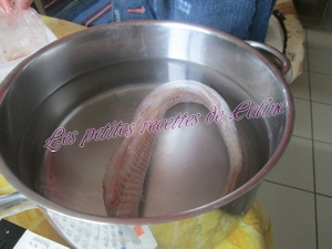 Passez sous l’eau les morceaux de roussettes, puis bien les éponger avec de l’essuie tout. Les mettre dans une casserole d’eau bouillante pour les faire cuire, 15 à 20 min.