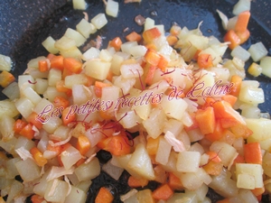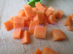Pelez la pomme de terre, coupez-les en cube d’un demi-centimètre de côté. Epluchez et détaillez également la carotte en petits cubes.