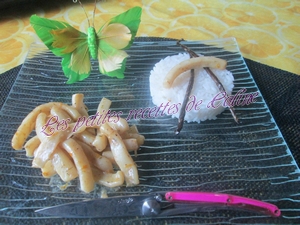 Arroser avec le jus de citron puis laisser cuire 10 min avant d’incorporer la crème avec le zeste de l’orange. Saler, poivrer, ajouter un peu d’ail semoule. Une fois que la sauce à épaissi, servir sans attendre sans oublier d’ôter la gousse de vanille, accompagnez avec du riz blanc.