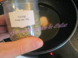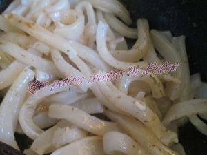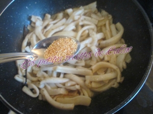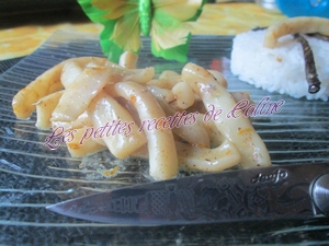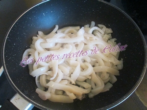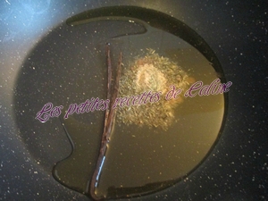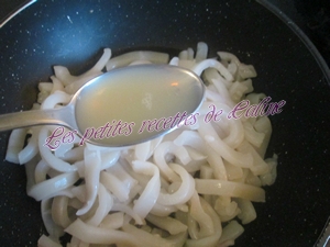 Faire chauffer l’huile dans une poêle. Y faire revenir à feu doux le gingembre avec le thym et la gousse de vanille fendue, puis ajouter les anneaux d’encornets décongelé