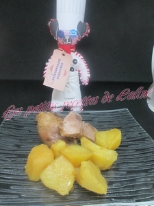 Servir avec des haricots verts ou pommes de terre, pour ma part, j’avais fait cuire les pommes de terre à l’eau et 10 min avant la fin de cuisson de la cuisse j’ai mis mes quartiers de pommes de terre dans la cocotte avec la viande