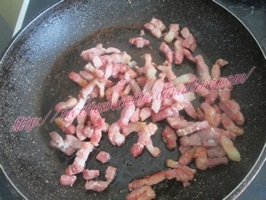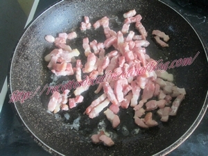Faire revenir les lardons à la poêle et couper le camembert en petits dés.