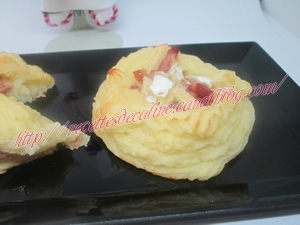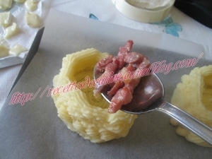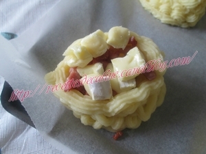 Placer les lardons grillés dans les nids et recouvrir avec quelques dés de camembert.