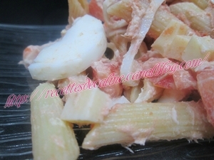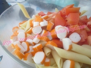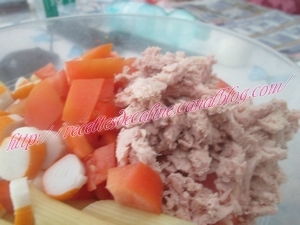 Ajoutez le thon émietté, les surimi coupés en petits tronçons, les oeufs durs coupé en rondelles, les tomates coupés en petits dès et les dès de gruyère.