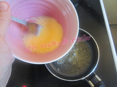 Cuire rapidement l’omelette à la poêle, dans le beurre. ( Si vous avez la chance d’avoir une petite poêle, faire 2 petites omelette, sinon faire une seule et la couper ensuite)