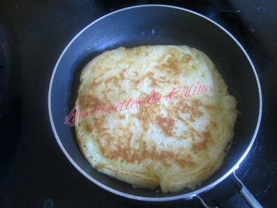 Laissez cuire un peu comme une crêpe, surveillez de temps en temps, il faut qu’il soit doré, une fois cuit d’un côté, faire la même chose avec l’autre coté