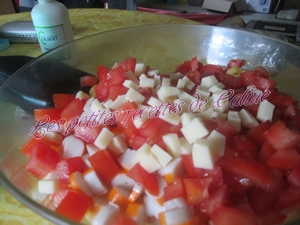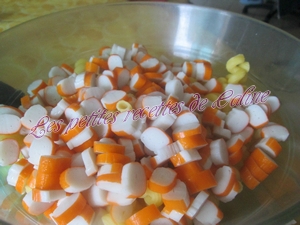 Faites cuire les pâtes et les refroidir a l’eau froide, versez-les dans un saladier.