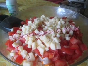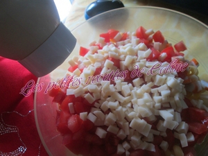Coupez les tomates, le surimi et le gruyère en petits morceaux, les verser dans le saladier avec les pâtes et rajoutez la mayo. Mettez un peu au frais avant de servir.