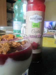 ** Pour le coulis de framboises, vous pouvez prendre celui du commerce ou maison 250 g framboises -75 g de sucre poudre 2 cuillères à soupe eau. Laisser le tout cuire à feu très doux, puis filtrer pour enlever les grains
