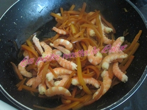 Au bout des 30 min de cuisson des carottes, ajouter les crevettes et poursuivre la cuisson à feux doux avec le couvercle pendant environ 10 min.