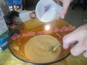 Cassez les œufs dans un saladier et battez-les en omelette. Ajoutez le sucre, mélanger, puis ajouter la farine tamisée petit à petit. Mélangez bien à nouveau puis ajouter le lait et le sucre vanillé ( pour ma part vu que je fais mon sucre vanillé moi même du coup, je n’ai pas mis le sachet de sucre vanillé).