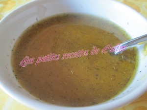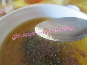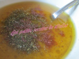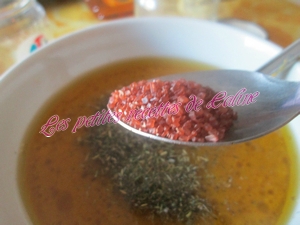 Mélangez dans un saladier ou bol, le miel, la moutarde, l’huile, le thym, sel et poivre.