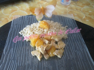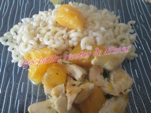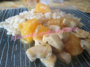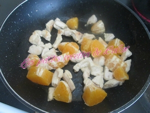 Faites chauffer l’huile d’olive dans une sauteuse puis faites revenir la viande 5 min à feu vif. Ajoutez les cubes d’oranges et le gingembre. Arrosez de jus d’orange et de citron. Salez et poivrez. Mélangez le tout et poursuivre la cuisson 5 à 7 min.