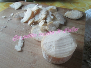 Placez 1 rondelle au centre de chaque tranche de pain de mie un peu de fromage (j’en ai mis un peu plus car le Charola est un petit fromage dur donc il s’effrite).