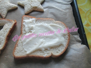 Beurrez deux tranches de pain de mie, et déposez le côté beurré sur une plaque de cuisson préalablement recouverte d’une feuille de papier cuisson.