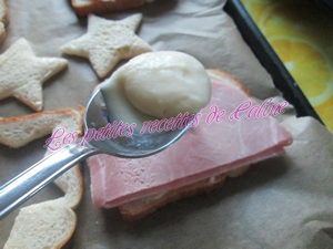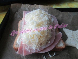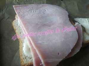 Sur cette première tranche de pain de mie déposer un peu de la béchamel, 1 tranche de jambon blanc coupé en 2, recouvrez de béchamel, mettre un peu de gruyère râpé.