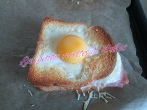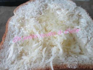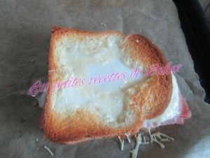 – Sur le petit morceau de pain restant ( le milieu de la seconde tranche) déposez un peu de gruyère râpé et passer au four, attention à la cuisson, car c’est rapide