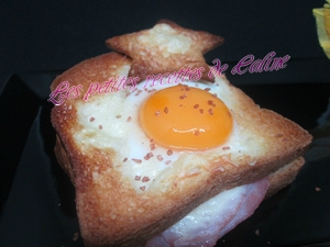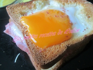 Faites un trou dans la seconde tranche du pain de mie avec un verre, beurrez-les (pour ma part, je les ai beurré avant de faire le trou, comme ça pas de perte, j’ai fait cuire aussi le milieu) et placez le blanc d’oeuf à l’intérieur (je le fait à la petite cuillère pour être sûr que ça coule pas de tout les côtés), enfournez pour environ 10 à 12 min (tout dépend de comment vous aimez la cuisson du pain) à 180°C (Th.6), au bout des 10 à 12 min, sortir la plaque du four puis mettre le jaune d’oeuf dessus et enfourner pour 2 min (PAS PLUS).