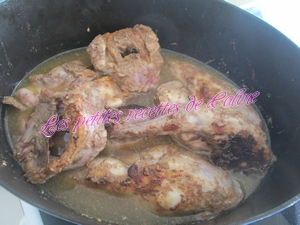 Dans une cocotte, faites chauffer 1 cuil à soupe d’huile d’olive, y faire revenir le lapin, réserver sur une assiette. Ajoutez les 40 cl de fond de volaille et la maïzena diluer au préalable dans un peu d’eau (cela évite les grumeaux) remettre votre viande dans la sauce..