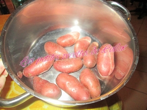 Faire cuire des pommes de terre (j’ai pris des pommes de terre rouge, mais vous pouvez utiliser les pommes de terre normal) à l’eau avec la peau, dès qu’elles sont cuites les éplucher.