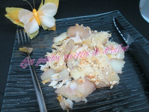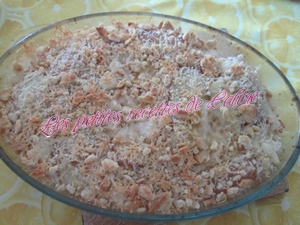 Faire une chapelure avec un mélange de gruyère râpé et chapelure. Versez sur le dessus du plat, déposer quelques noisettes de beurre et enfournez jusqu’a ce que la chapelure est coloré