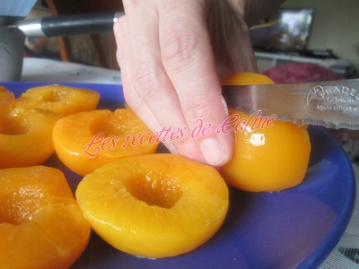 Garnir les oreillons de pêches (j’ai coupé le fond des oreillons de façon a ce qu’ils tiennent bien à plat).