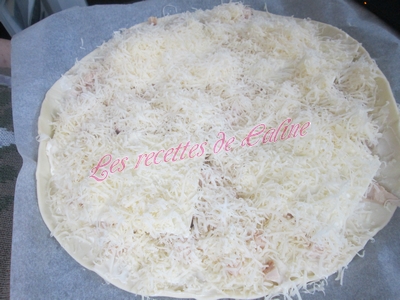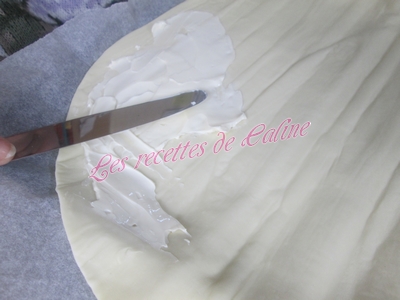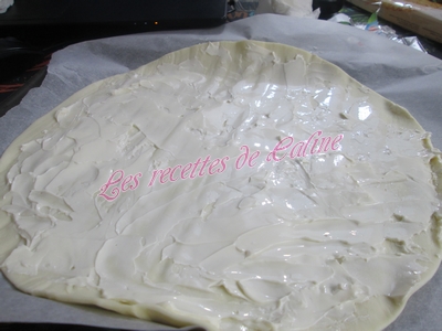 Tartiner la pâte feuilletée (ou brisé) de crème fraîche (ou de vache qui rit pour ma part, car ma moitié n’est pas très crème fraîche).
