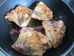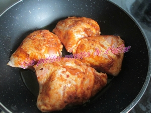 Faites chauffer une poêle avec 1 cuil à soupe d’huile d’olive, y déposer les hauts de cuisse et les faire cuire 25 min en les retournant régulièrement. Arrosez-les régulièrement aussi avec la sauce de la poêle