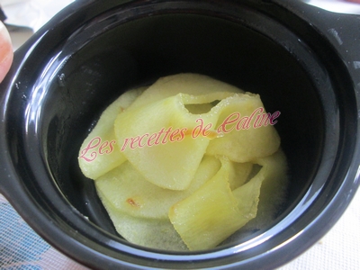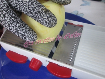 Pelez les pommes, ôtez le trognon et coupez-les en rondelles très fines, au robot ou à l’aide d’une mandoline, mettre un peu de jus de citron sur les tranches de pommes, ça évite l’oxydation.