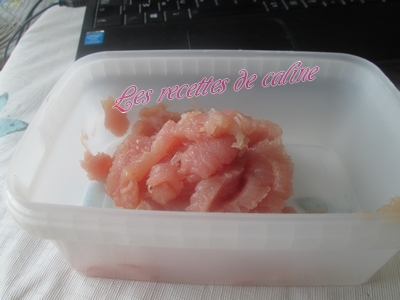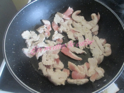 Dans une poêle chaude, verser l’huile d’olive et colorer les lamelles de poulet sur chaque face. Ajouter un peu d’eau, mettre un couvercle et laisser hors du feu durant 4 min. Une fois cuit, laissez refroidir.
