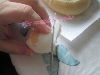 Cuire les oeufs dans une casserole d’eau bouillante pendant 10 min, puis les rafraîchir et les écaler. Les couper ensuite en tranches dans la longueur.