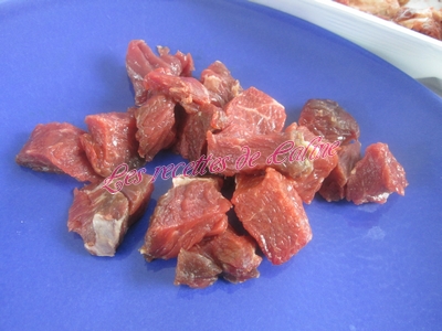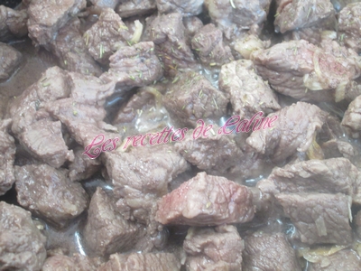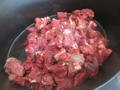 Dans une cocotte en fonte, faire revenir la viande dans 1 cuil à soupe d’huile d’olive.