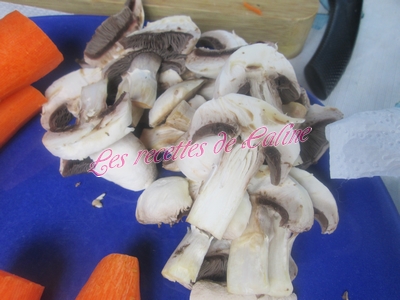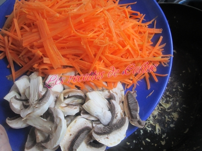 Eplucher et découper les carottes en rondelles (ou julienne comme je le fais), les champignons et émincer vos oignons (pour ma part, j’utilise des lanières d’oignons séchés, donc je passe l’étape des oignons).