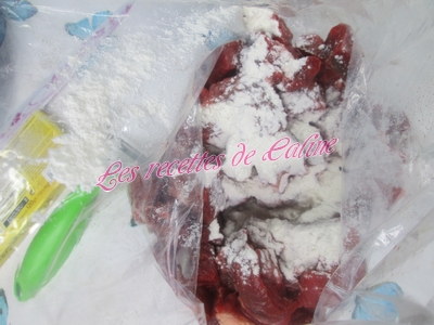 Découper votre viande en dés et les rouler dans la farine (pour éviter de se fariner trop les mains, j’utilise un sac congélation, j’y mets ma viande et ensuite la farine et je secoue correctement afin que la viande soit bien fariné).
