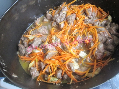 Lorsque les légumes ont sués, placer la viande sur les légumes de la cocotte et le bouillon (eau plus carré de bouillon). Saler,poivrer. Laisser mijoter, couvercle dessus, pendant 2 h au moins