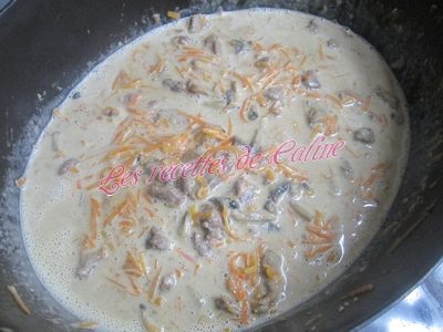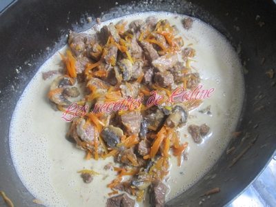 Retirer la viande et les légumes et incorporer la crème au bouillon. Bien mélanger le tout pour obtenir une sauce onctueuse.